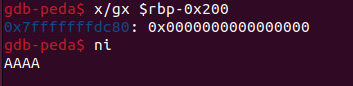 x/gx 로 rbp-0x200 에 아무런 값이 안들어가있으니 ni 로 한단계진행후 AAAA 라는 값을 넣어보고 다시 실행해본다