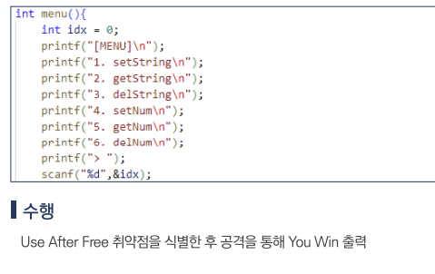 메모리 관리에서 발생할 수 있는 취약점 중 하나로 이 취약점은 프로그래밍에서 동적으로 할당된 메모리를 사용한 후 해제(free)했음에도 불구하고, 해당 메모리를 다시 사용하는 상황에서 발생한다.