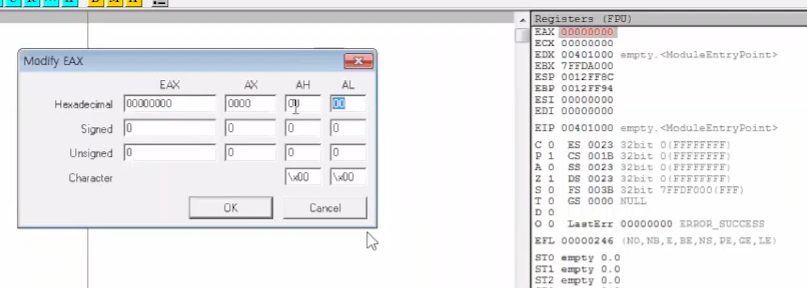 이렇게 EAX 를 OllyDBG에서 변경도가능한데