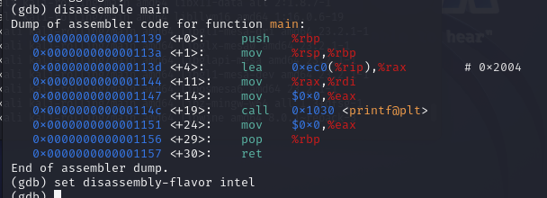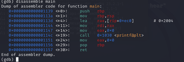 0x000000000000114c <+19>: call 0x1030 <printf@plt>