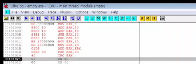 Code Window 에서 어셈블리어 코드를 이렇게 변경한뒤에 하나 진행하는 F8 로 실행해본다
