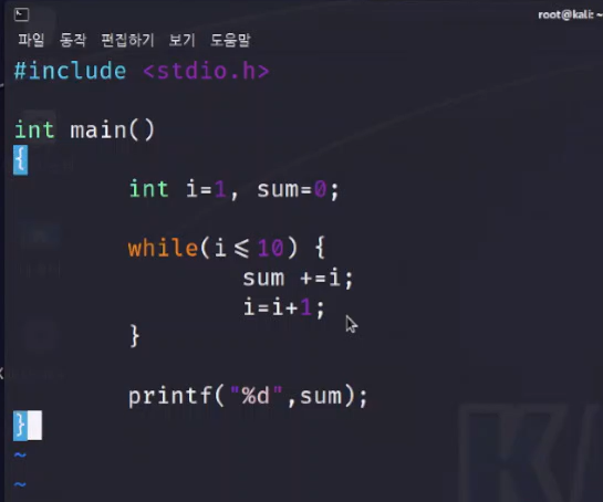 위와같이 i 가 10 이 될때까지 1씩 더해주는데 1씩 증가한 값을 sum 이라는 변수에 더해준다